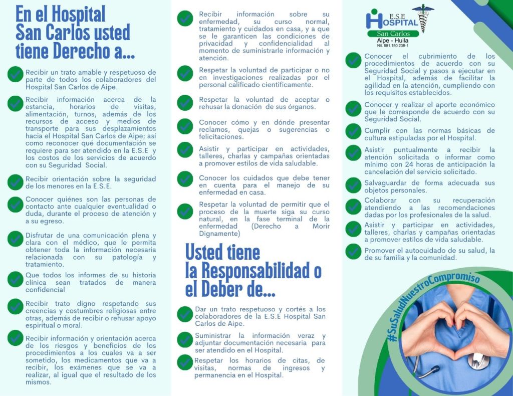 3 Por admin_sancarlos Noticias febrero 17, 2021 Los usuarios de la Empresa Social del Estado Hospital San Carlos de Aipe Huila tienen los siguientes derechos y deberes: _________________________________________________________________________ 3 deberesderechos admin_sancarlos / Sobre el autor Más artículos de admin_sancarlos